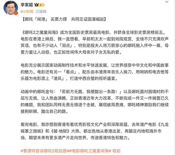 李家超说,电影中哪吒的金句“若前方无路,我便踏出一条路”,以及哪吒面对困境时的不屈与无惧,让人热血沸腾。同时也让他想到,这正如香港近年大力改革,不断完成一件又一件搁置已久的难题,他和团队同样无畏无惧逐个击破,展现破局思维,“哪吒精神激励我们继续披荆斩棘,踏出自己的路”。