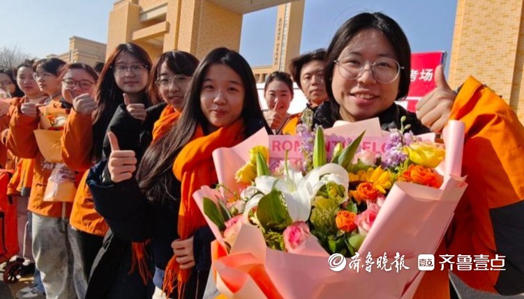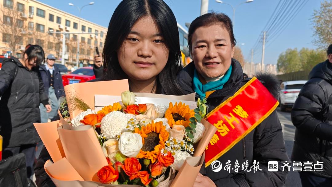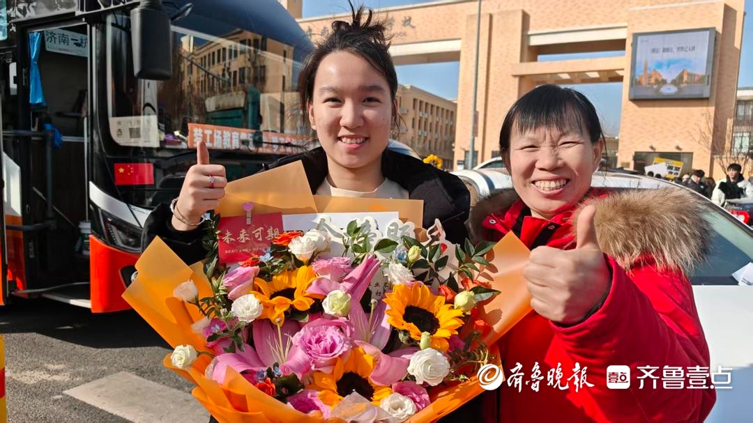 艺考结束了!在济南外国语学校考点,参加完2026年山东省美术与设计类专业统考的聂琳收到妈妈送的鲜花,高兴地脸上开了花。