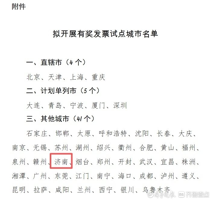 商务部、财政部、国家税务总局1月23日对外公示拟开展有奖发票试点城市名单,济南等50个城市入选。
