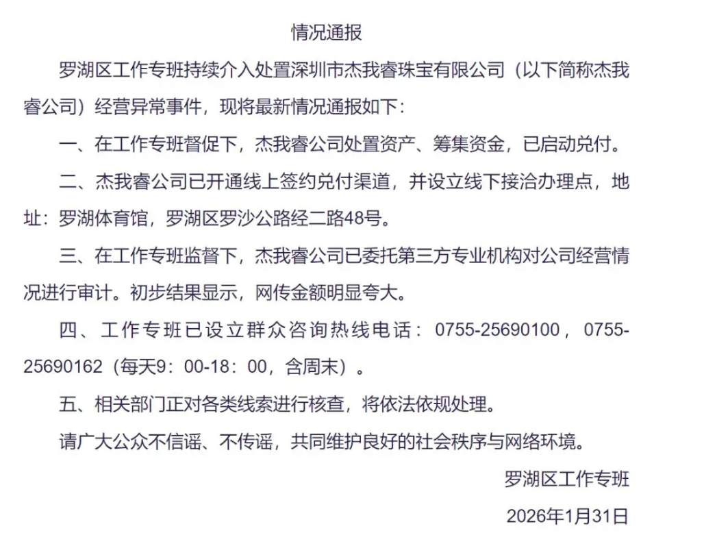 罗湖区工作专班持续介入处置深圳市杰我睿珠宝有限公司(以下简称杰我睿公司)经营异常事件,现将最新情况通报如下: